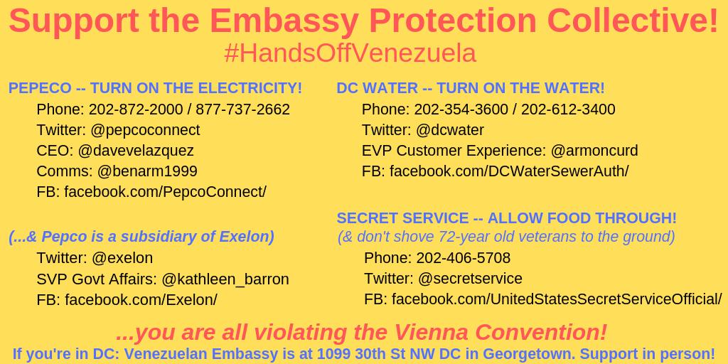 Here's some contact information to support the Embassy Protection Collective, who are without water & electricity and low on food because the @SecretService, @PepcoConnect (@Exelon), & @DCWater continue to violate the Vienna Convention & basic human rights. #HandsOffVenezuela